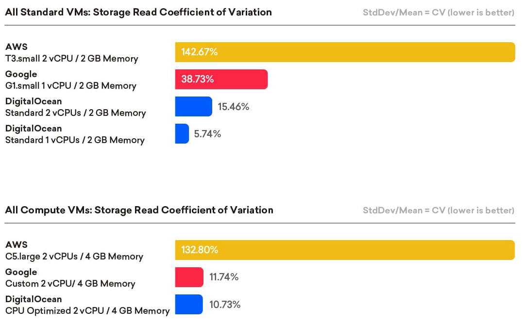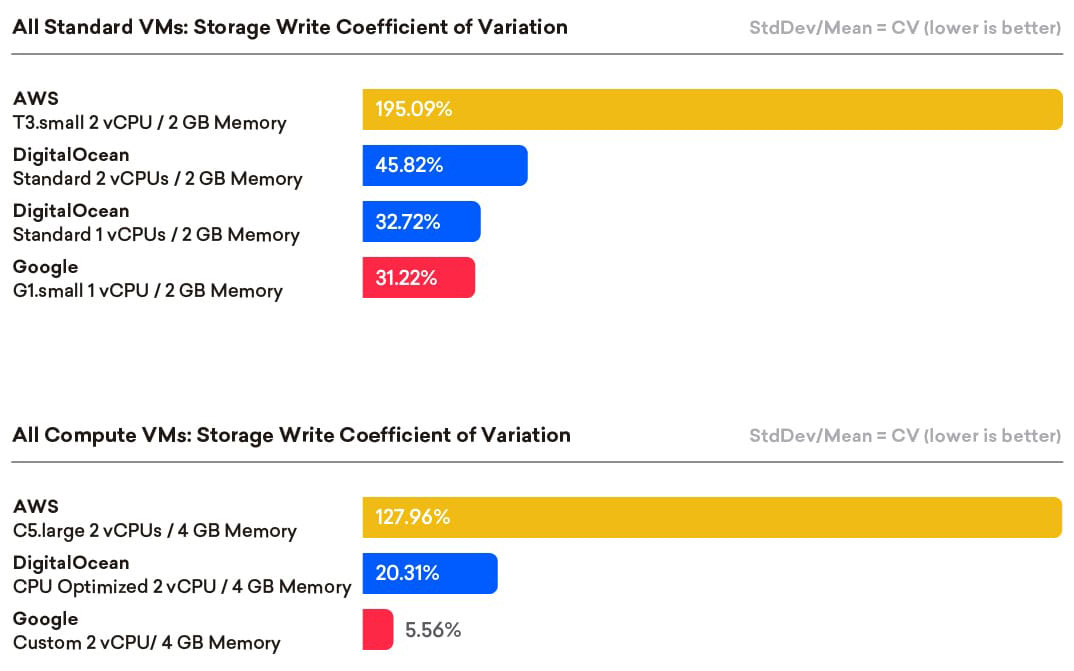 • AWS, utilizing EBS volumes with burst, show high variability with CVs exceeding 130%, while GCE and DigitalOcean showed similar variation.