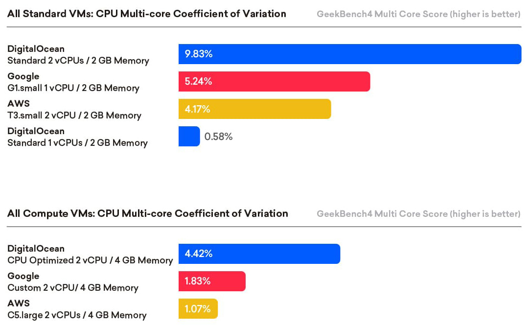 • Among the smallest Basic offerings, DigitalOcean’s 1CPU 2GB instance was found to have impressively low variation while outperforming GCE’s opportunistic g1-small VM.