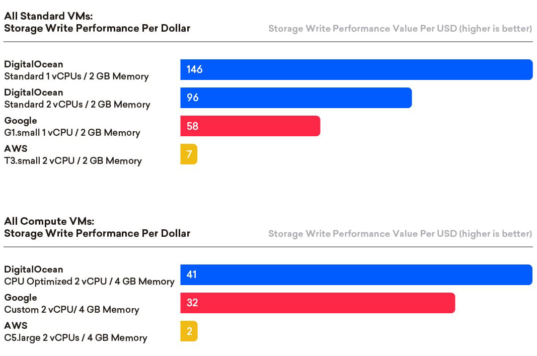 • DigitalOcean’s high price-performance scores are due to a combination of achieving the fastest write speeds in the respective classes coupled with substantially lower monthly pricing, particularly within the Basic class.