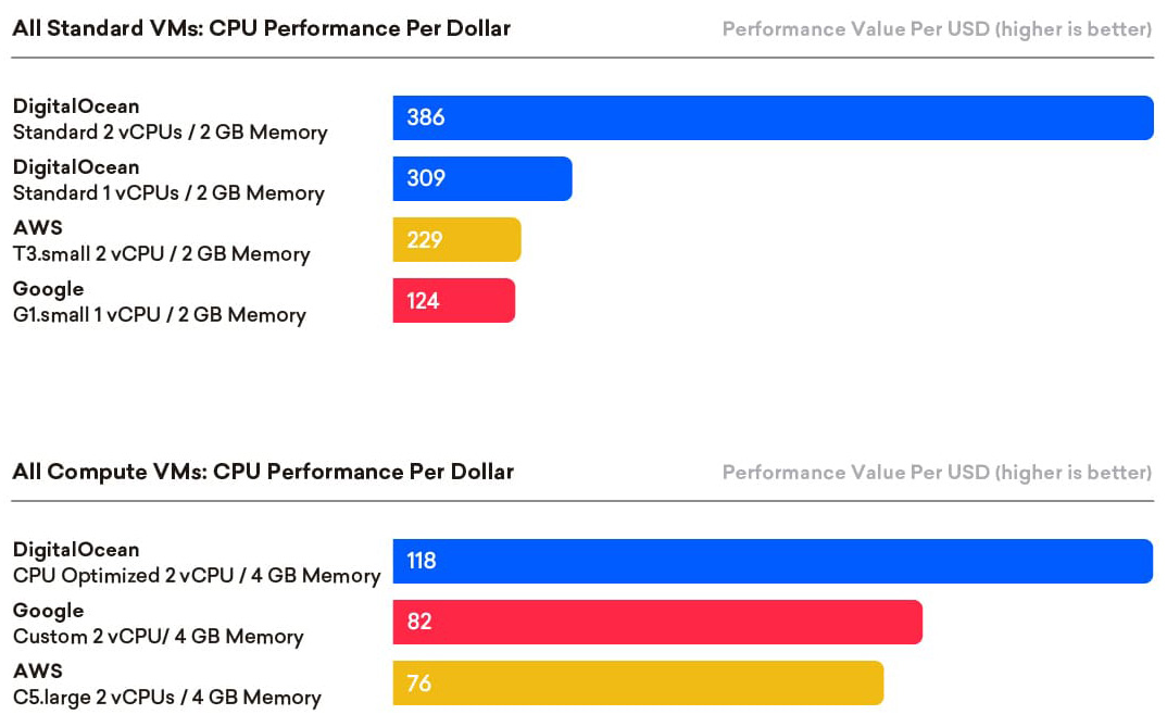 • In general, as VM sizes increase, price-performance trends down. The exceptions are DigitalOcean’s 2 vCPU Basic VM with notably high CPU performance, and Amazon’s T3.small, though this machine may incur substantial fees if used for CPU intensive workloads. That said, the increased RAM of compute-optimized machines from these providers may be required for use cases such as database operations or moderately busy multi-role Web servers.
