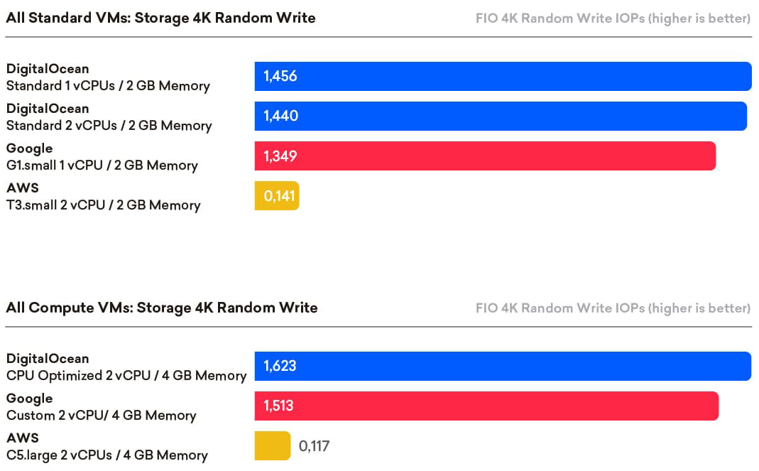 • For 4K random write performance, DigitalOcean also posted the best scores, although raw results were not as dominant as the read testing.