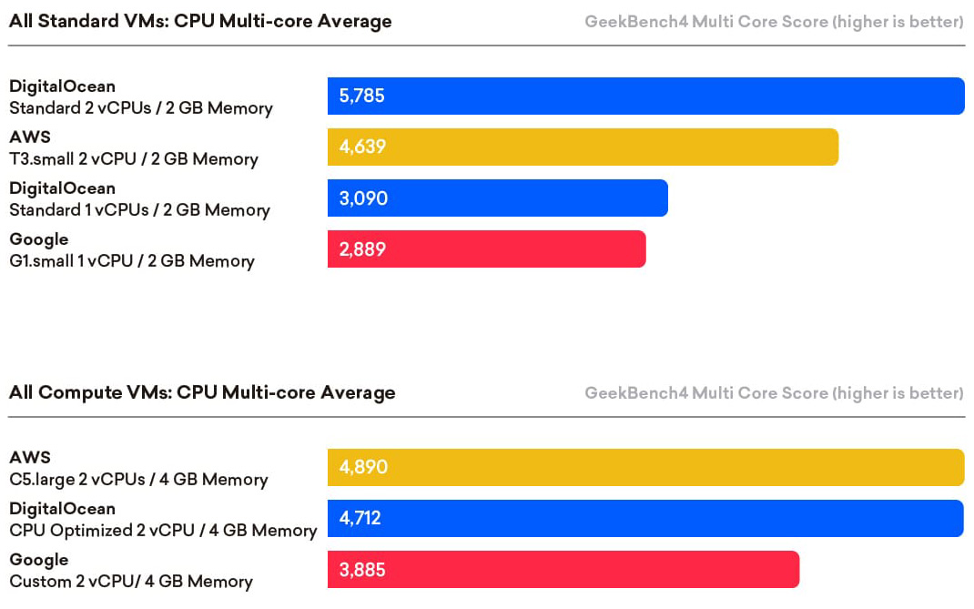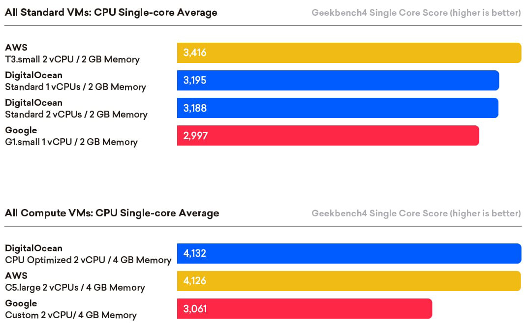 • DigitalOcean’s basic VMs outperformed rival offerings. DigitalOcean’s basic 2 vCPU 2GB Droplet surpassed Amazon’s recently-released T3.small with unlimited “burst,” and DigitalOcean’s 1 vCPU 2GB Droplet outperformed the burstable Google g1-small VM.